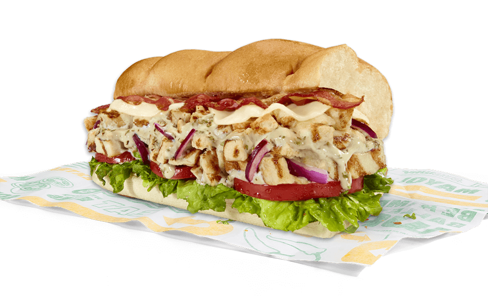 Chicken, provolone cheese, bacon, lettuce, tomatoes, onions, roasted garlic aioli, toasted